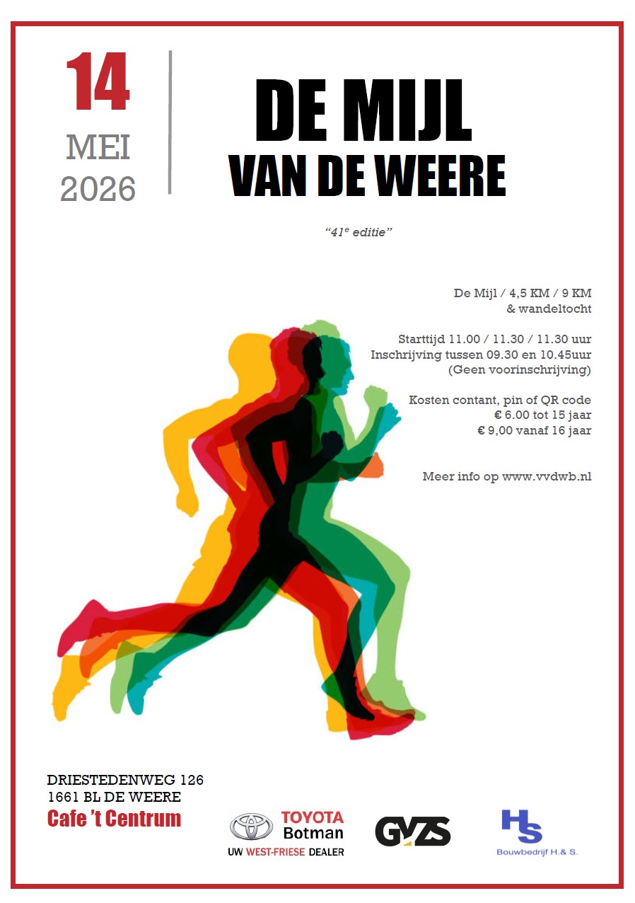 Om 11:00u start de Mijl van De Weere en om 11:30u gaan de afstanden 4,5 en 9,0 km van start. We hopen veel deelnemende DWB'ers te zien.